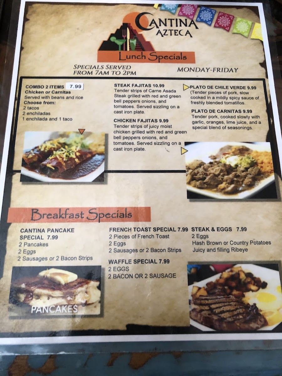 Choose between AMERICAN STYLE TACOS (Choice of meat, corn tortilla lettuce, cheese & tomatoes), MEXICAN STYLE TACOS (Choice of meat in a small soft tortilla, cilantro & onion), ENCHILADA (Meat or cheese), or SMALL BURRITO (Choice of meat, rice, beans & cheese). Served with beans & rice.