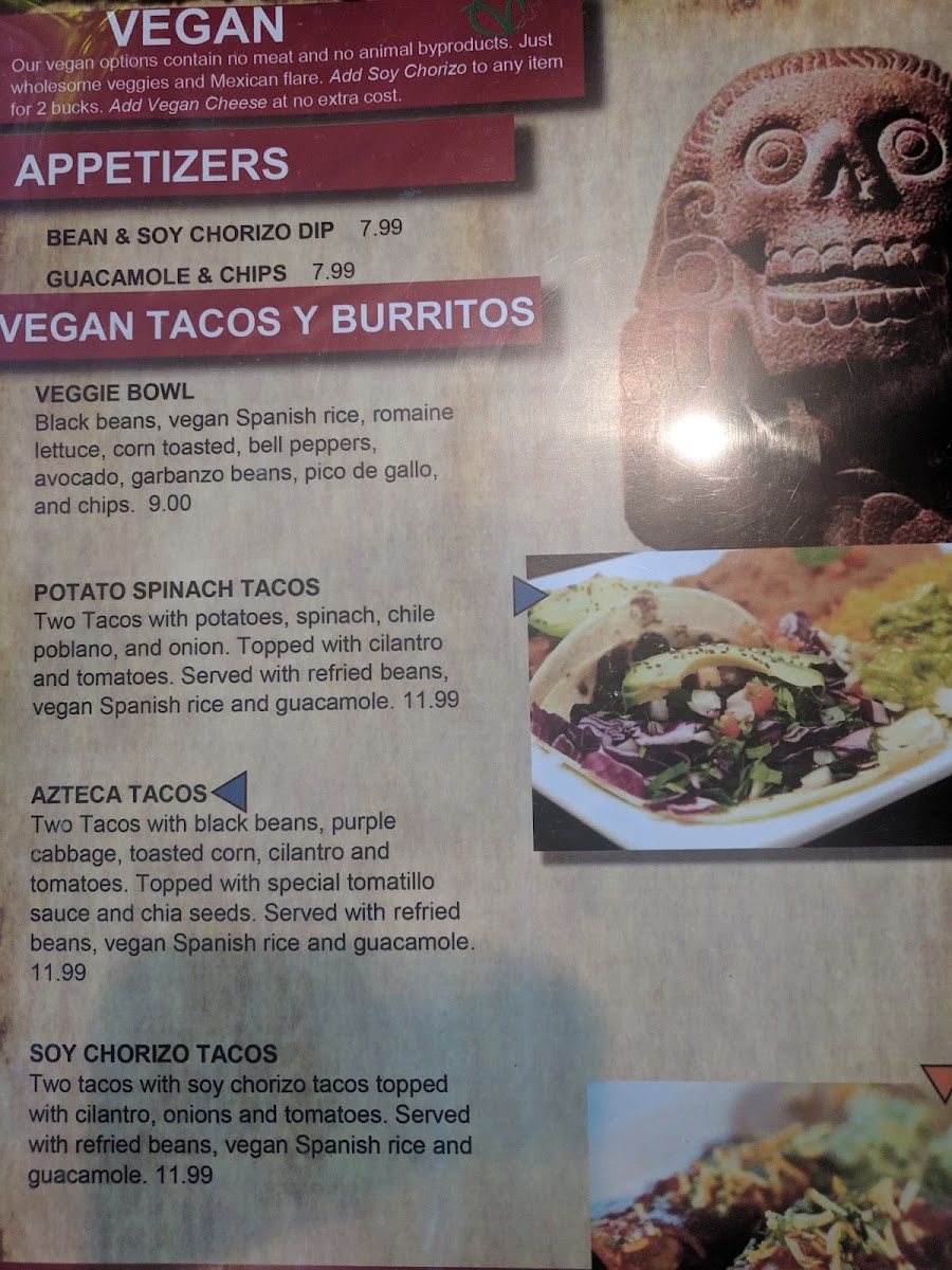 2 tacos with soy chorizo, diced green chiles and corn. Topped with cilantro, onions & tomatoes.